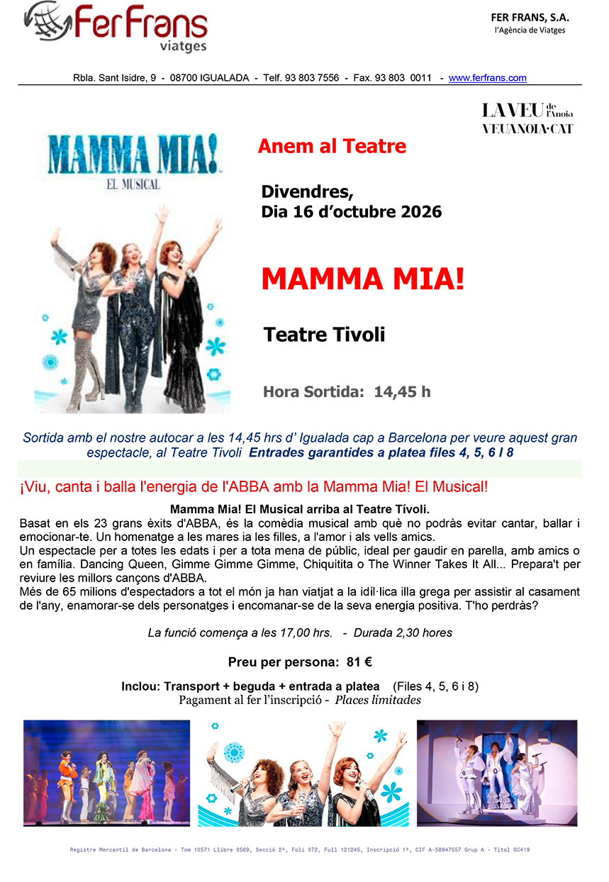 Sortida d'Igualada a les 14,45 hrs cap a Barcelona. Entrades garantides a Platea a les Files 4, 5, 6